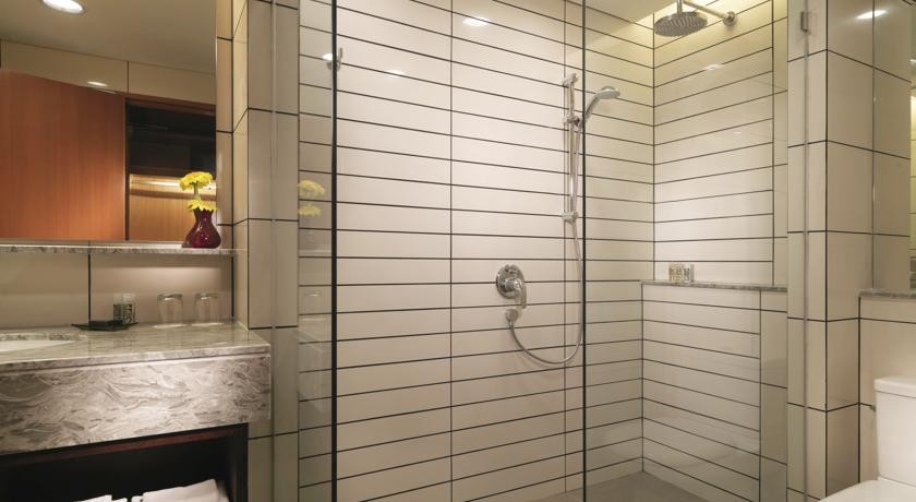 والحمام له باب داخلي بالغرفة، وبه مكان زجاجي مغلق للاستحمام، ومتوفر به ما قد يحتاجه أي نزيل بالفندق من أدوات استحمام وسوائل استحمام، وفوط وبشاكير كبيرة للتجفيف، وجميع خدمات التنظيف متوفرة ومجانية.